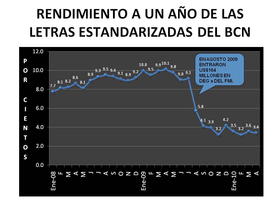La concentración de la cartera de crédito demuestra la falta de compromiso de las instituciones financieras reguladas con el desarrollo del país. Esta falta de compromiso tiene también estrecha relación con la disponibilidad de recursos del sector público para financiar el déficit del gobierno central, especialmente en referencia a la emisión de títulos valores del sector público. Esta demanda de recursos financieros por parte del Gobierno Central se ilustra en la siguiente gráfica que muestra la baja del rendimiento de las letras estandarizadas del Banco Central de Nicaragua en agosto 2009, cuando el FMI entregó US$164.4 millones por orden del G-20. Consecuentemente, esta competencia por recursos financieros eleva las tasas de interés de los préstamos al sector privado cuando el gobierno central necesita financiar su déficit (siempre!), y reduce la disponibilidad y acceso de estos recursos para ser destinados a actividades productivas. Además, a marzo 2010 el 76.7% de las inversiones de los 7 bancos privados descansaban en títulos valores del tesoro público.