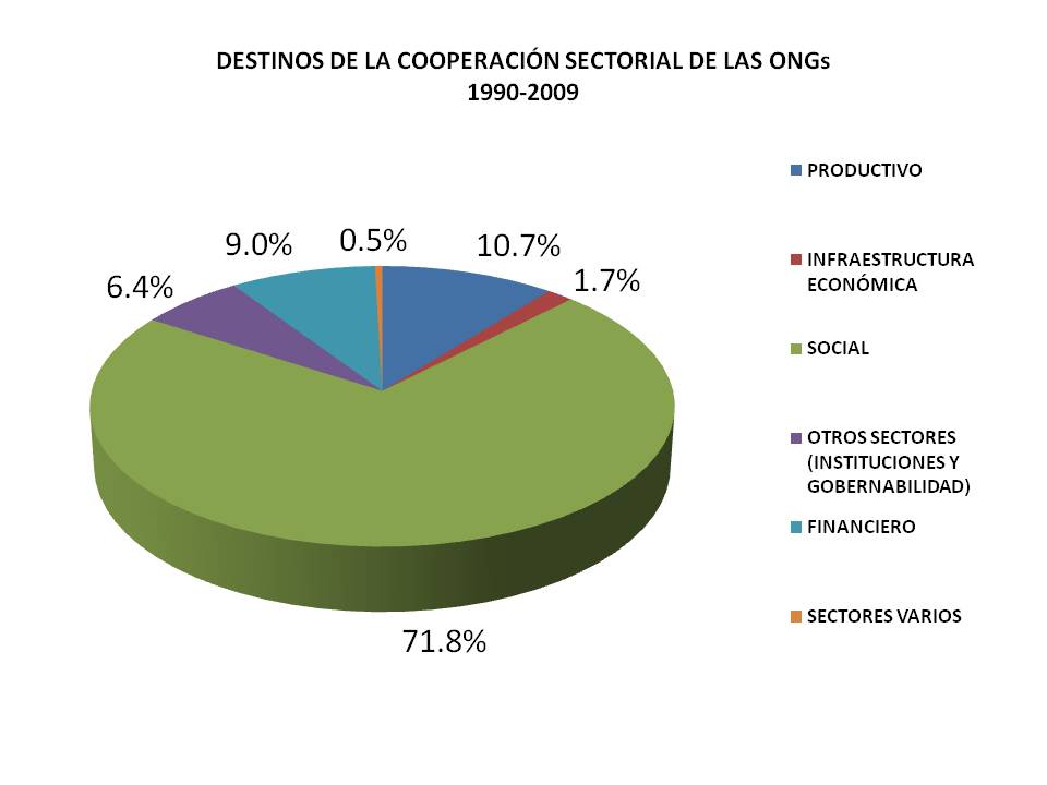 La cooperación facilitada por estos organismos y registrada en el Sistema de Información de los ONGs del MINREX suma US$1,745 millones durante el período 1990-2009, destinado a 6 sectores que son los siguientes en orden de importancia: