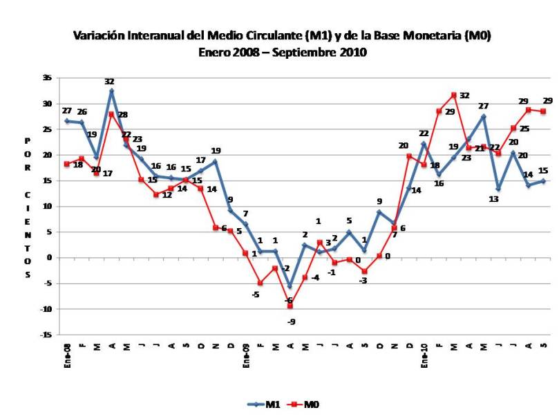 ¿Es este el momento de que el BCN compre bonos al Tesoro? Esto se puede responder con el comportamiento de la oferta de dinero y de la base monetaria, que en el caso de que ambas estén creciendo lentamente reforzaría la implementación del “relajamiento cuantitativo”, con más razón si se estuviesen contrayendo. Si desacelera el crecimiento del dinero, pues habría que incrementarlo. Por lo tanto, el comportamiento del agregado monetario más restringido, como es el dinero de alto poder (M0) nos obliga a señalar que no es  necesario el “relajamiento cuantitativo”, pero sí lo exige el comportamiento del medio circulante cuyo aumento interanual en septiembre de este año es la mitad de lo registrado en abril de 2008.