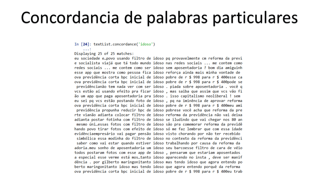 Using another popular NLP library, NLTK, we can see the concordance of particular words. In this case we look for tweets with the word Idoso (meaning senior person).
