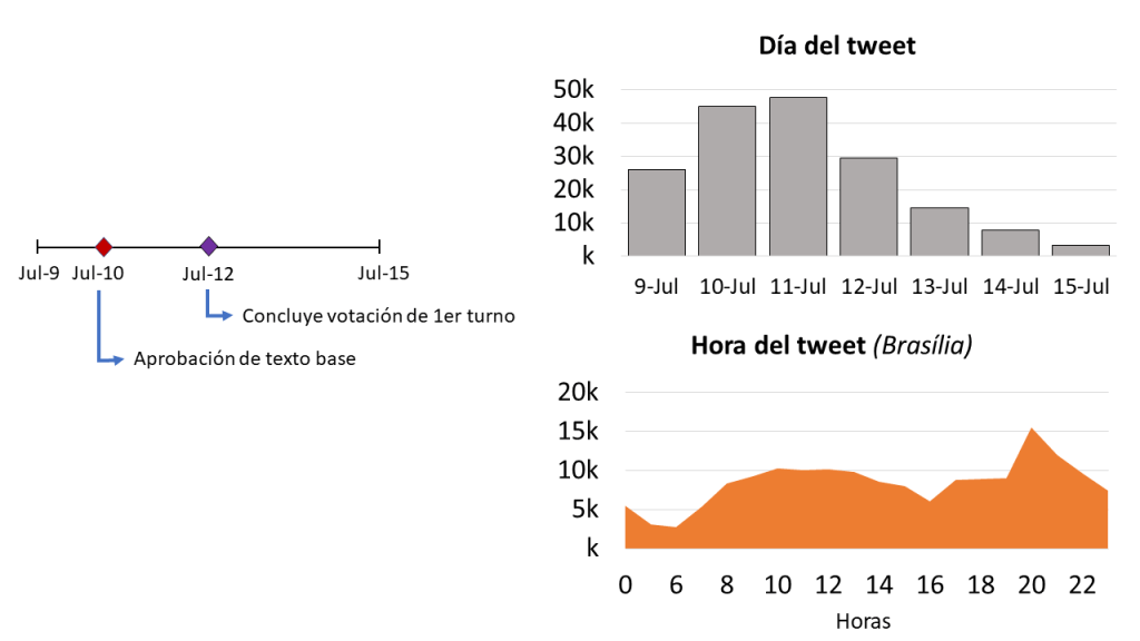 So, that code yields a json dataset including roughly 174 thousand tweets from the week of the first debate (-started on July 9th- to July 15th) of the reform’s proposal in the lower chamber of the legislative body (câmara dos deputados). Note: as the reform is a constitutional addendum it will have to go through 2 votes on that first instance and other two voting sessions on the Senate. The following graphs display our tweet’s timelines. This shows that the intensity of the tweets rose as the reform was discussed in the camara dos deputados, and declined as the base text was approved on the 10th and this first voting ended on the 12th. As for the time of day, people seem to be more active around lunch and after dinner. *With a broader stream listener we could see if these particular tweets are significant within Brazilian tweets at the time (out of our scope for now though).