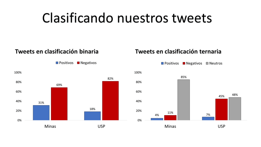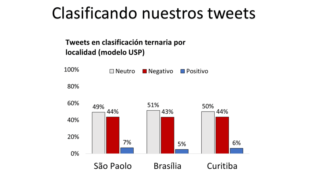 So, let’s apply those models to our ≈ 174k tweets! The figures ahead show the results. In general, our tweets are classified as being mostly negative (No news there!). When including the neutral class, the Minas model says our tweets are mainly neutral, and negative. USP’s model provides a balance between neutrality and negativity.