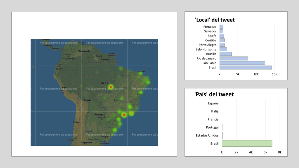 As mentioned before, Twitter’s geo-capabilities are limited, mostly because people do not usually share where they are tweeting from. Well, for those who do share, we are able to use Nominatin to translate location strings (eg. Belo Horizonte, Sao Paolo, etc.) into geocoordinates and do the following mapping. We can also see the distribution of locations and countries. That distribution seems to correspond with Brazil’s current demographic distribution, and may also correspond to Twitter activity in Brazil.