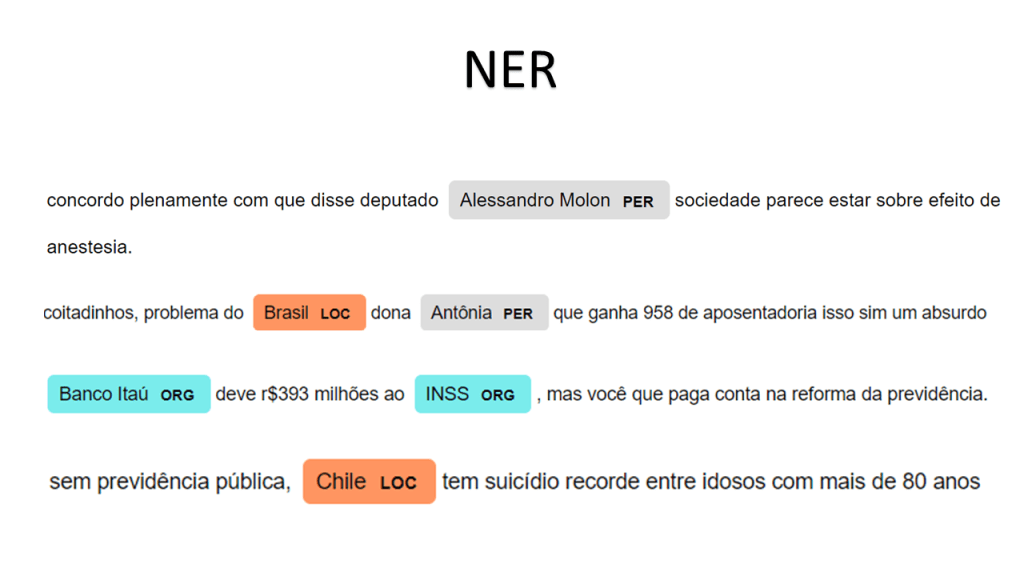 We can also do some Named-entity recognition (NER). The following examples show, for example, how spaCy’s model is good at recognizing that Alessandro Molon is a person, or that Brazil and Chile are locations.