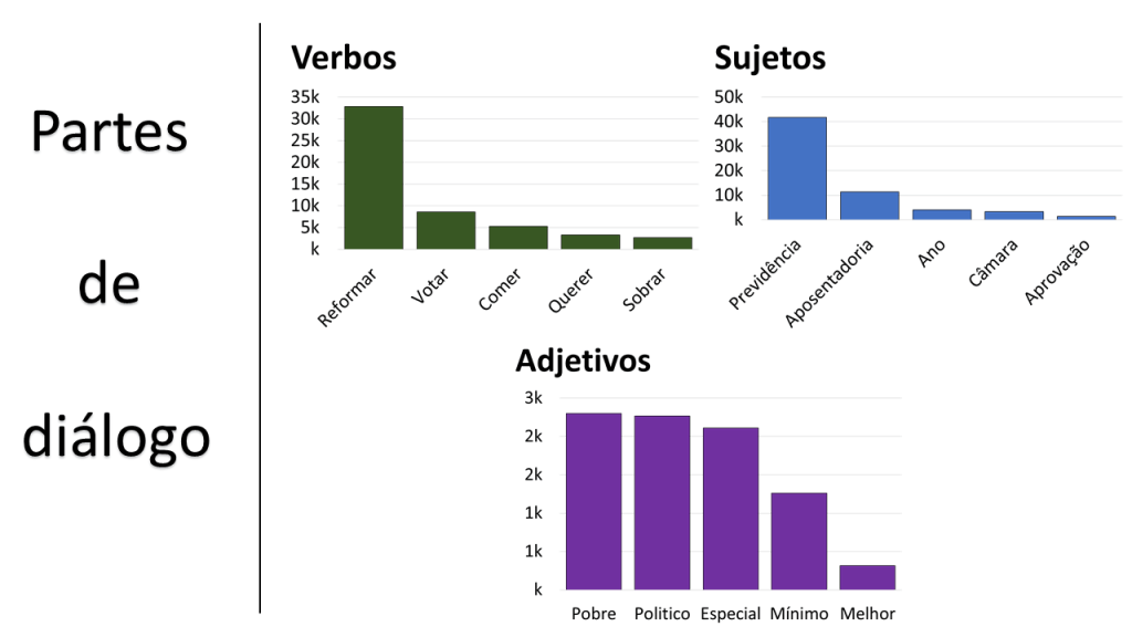 II) For the NLP part I’ll mostly use spaCy’s Portuguese CNN model (pt_core_news_sm), although I also use NLTK for some parts. Let’s see for example the most repeated Verbs, Nouns, and Subjects within our tweets (a.k.a Parts-Of-Speech). The usual suspects here, at least for the most common verbs and nouns. The most common adjectives, however, show that humans are still better at identifying POS, because the adjectives ‘Politico’, ‘Especial’, and ‘Mínimo’, actually refer to nouns in the context of this pension reform: they mean ‘Politicians’, ‘Special pensions’, and ‘Minimum wage or Minimum pensions’. I know this depends on how (over what) spaCy’s Portuguese model was trained, and that I could do some micro engineering about it, but still, there is no single model (yet) that gets every POS right.
