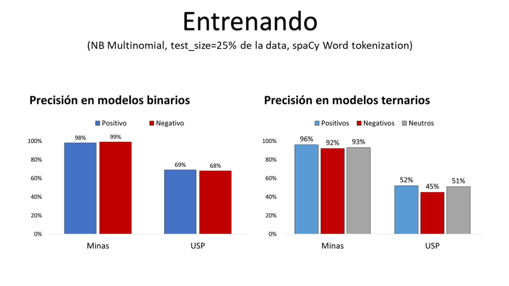 The Minas model yields better accuracy for both representations (possibly over-fitted though), and this is explained by the fact that this corpora is more ‘self-contained’ as it only relates to one topic (opinions regarding Minas Gerais’ goverment in 2017). The USP’s model, much bigger and more thematically disperse, yields lower accuracy estimates.